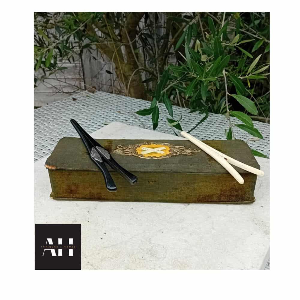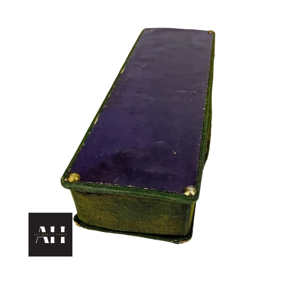 A well-loved set of antique glove stretchers comes in its original velvet box. This complete piece shows history, elegance, and a touch of shabby chic style. We love this item for both its charm and function, and it also makes a wonderful talking point.