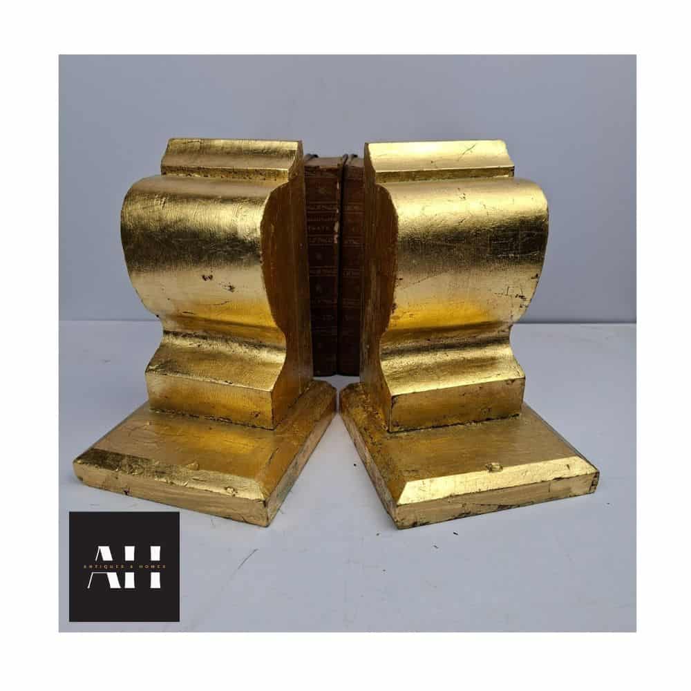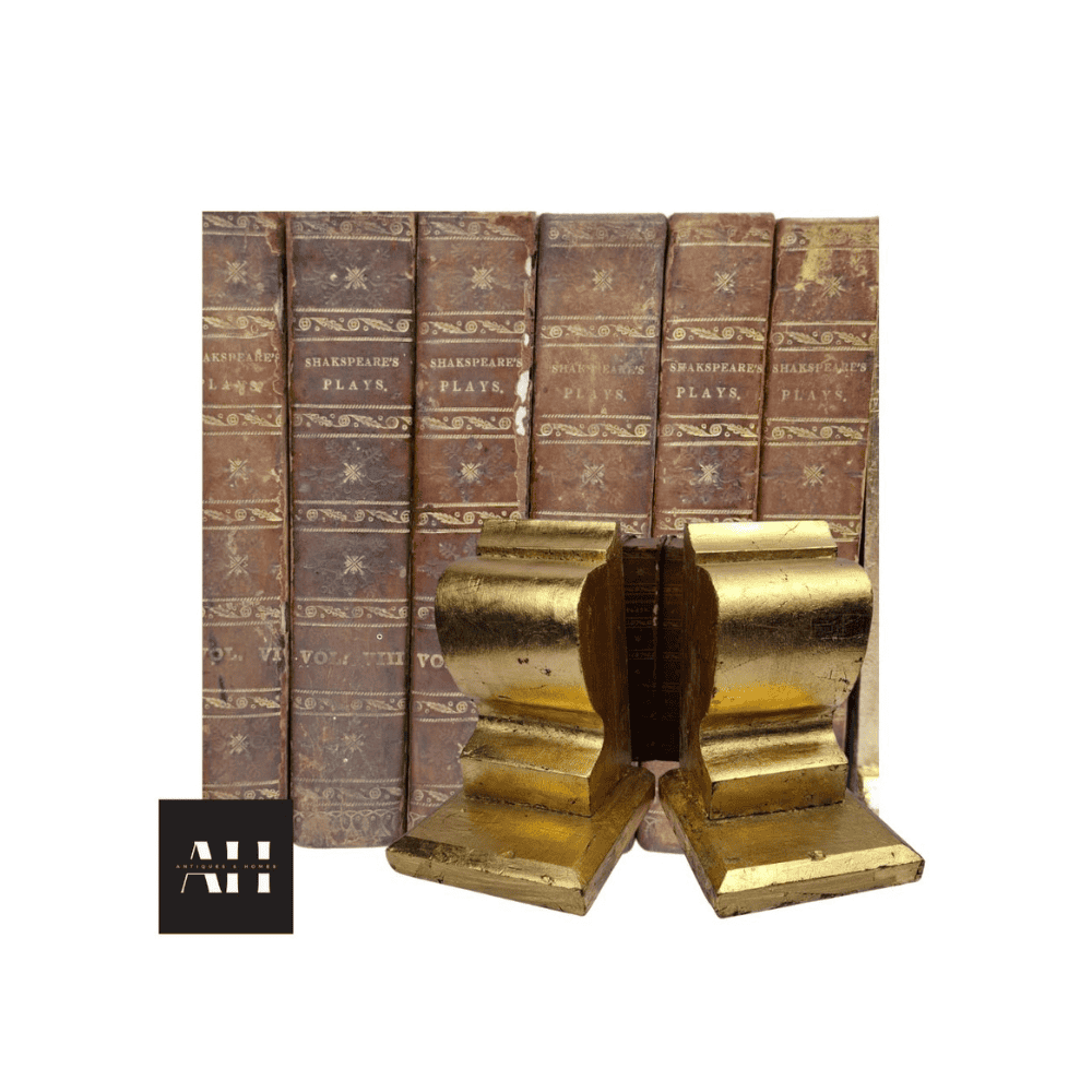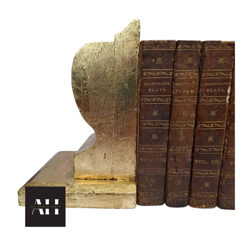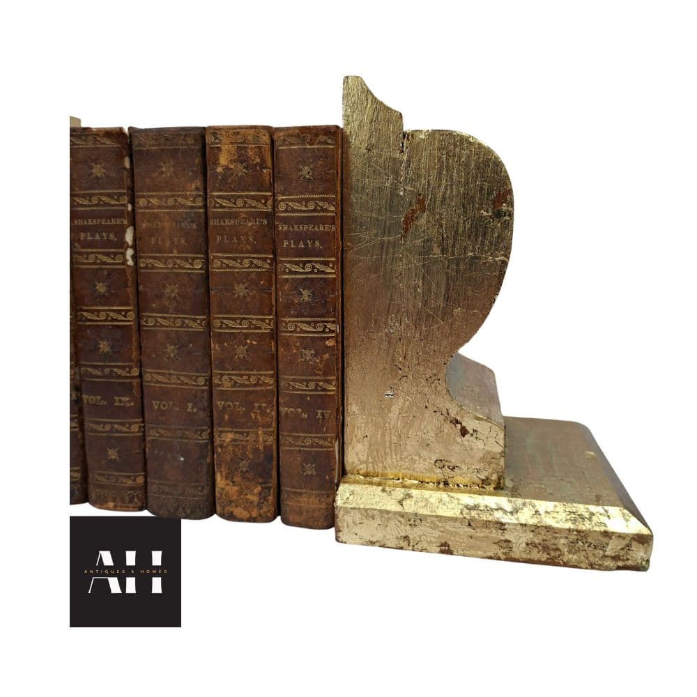 The gilded wooden bookends suit the set perfectly. Their warm tones complement the worn spines of the antique Shakespeare Books, creating a display that looks authentic yet stylish.