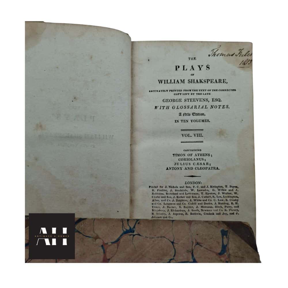 The covers display the correct titles, although the internal title pages show a charming early misprint that reads The Plays of William Shakspeare, missing the first “e”. Details like this make old sets of antique Shakespeare Books even more appealing, since they reflect early print history and quirks of the period.