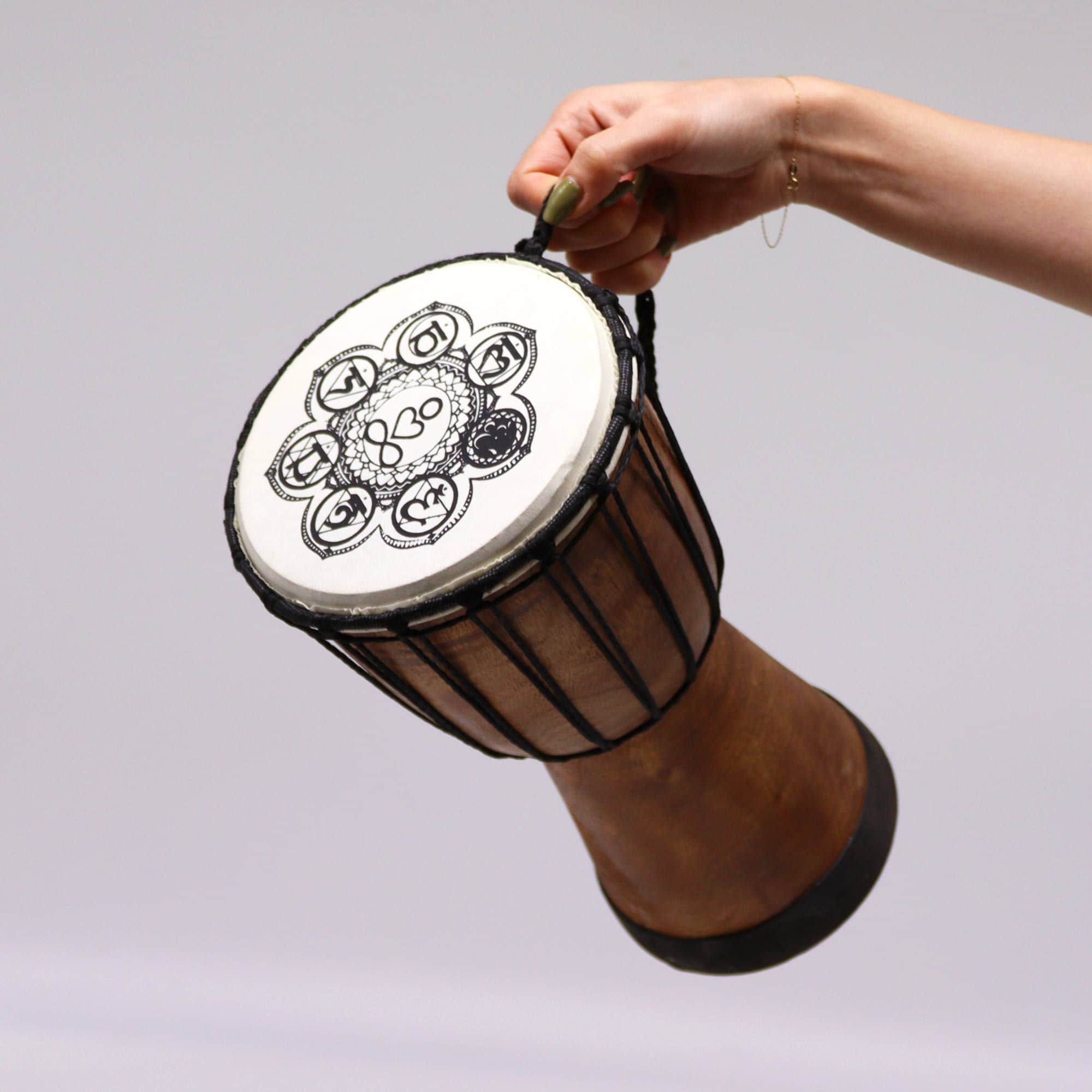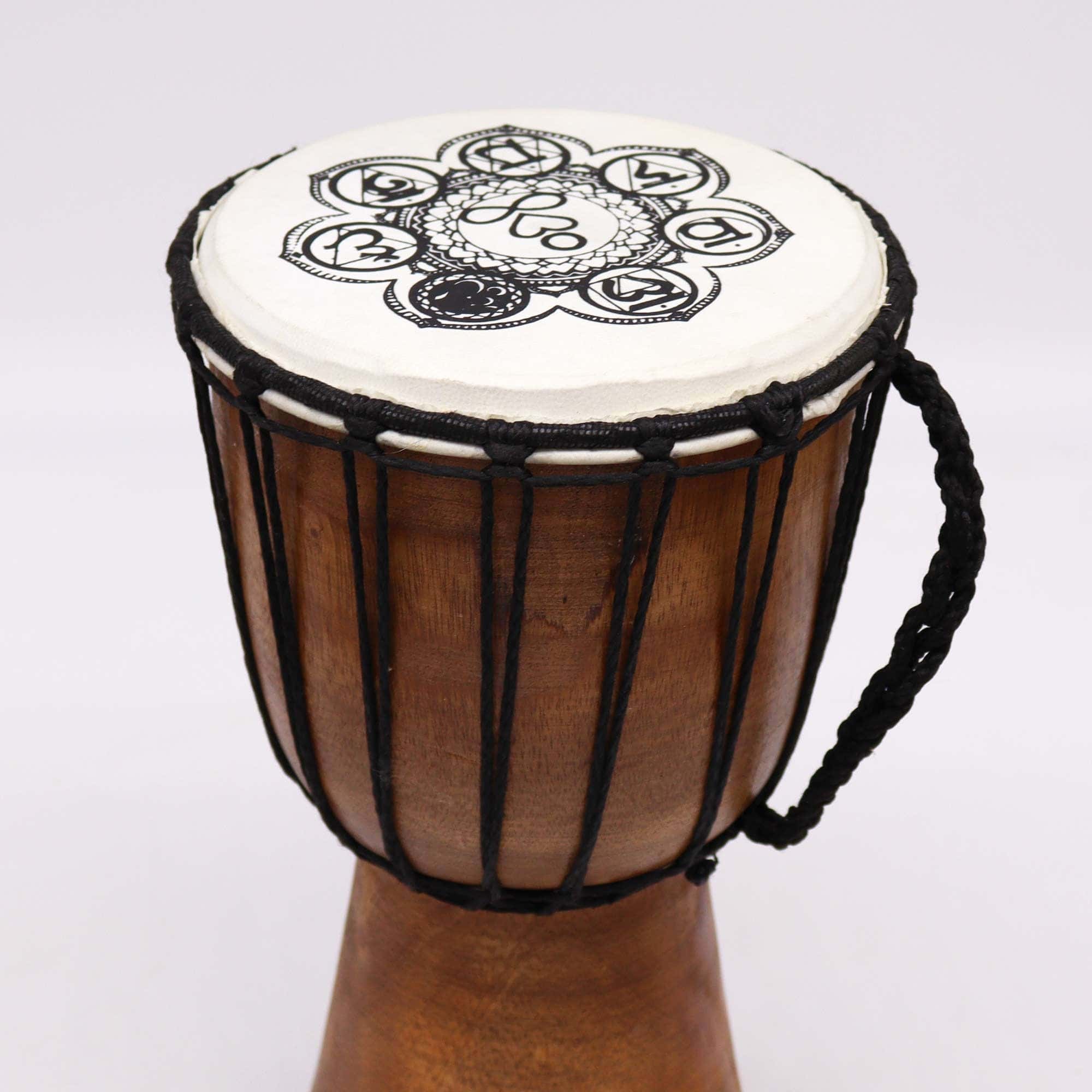 This 30cm Wide Top Djembe Drum features a hand-painted Chakra design on the skin, blending the rhythmic tradition of West African drumming with symbolic spiritual artistry.