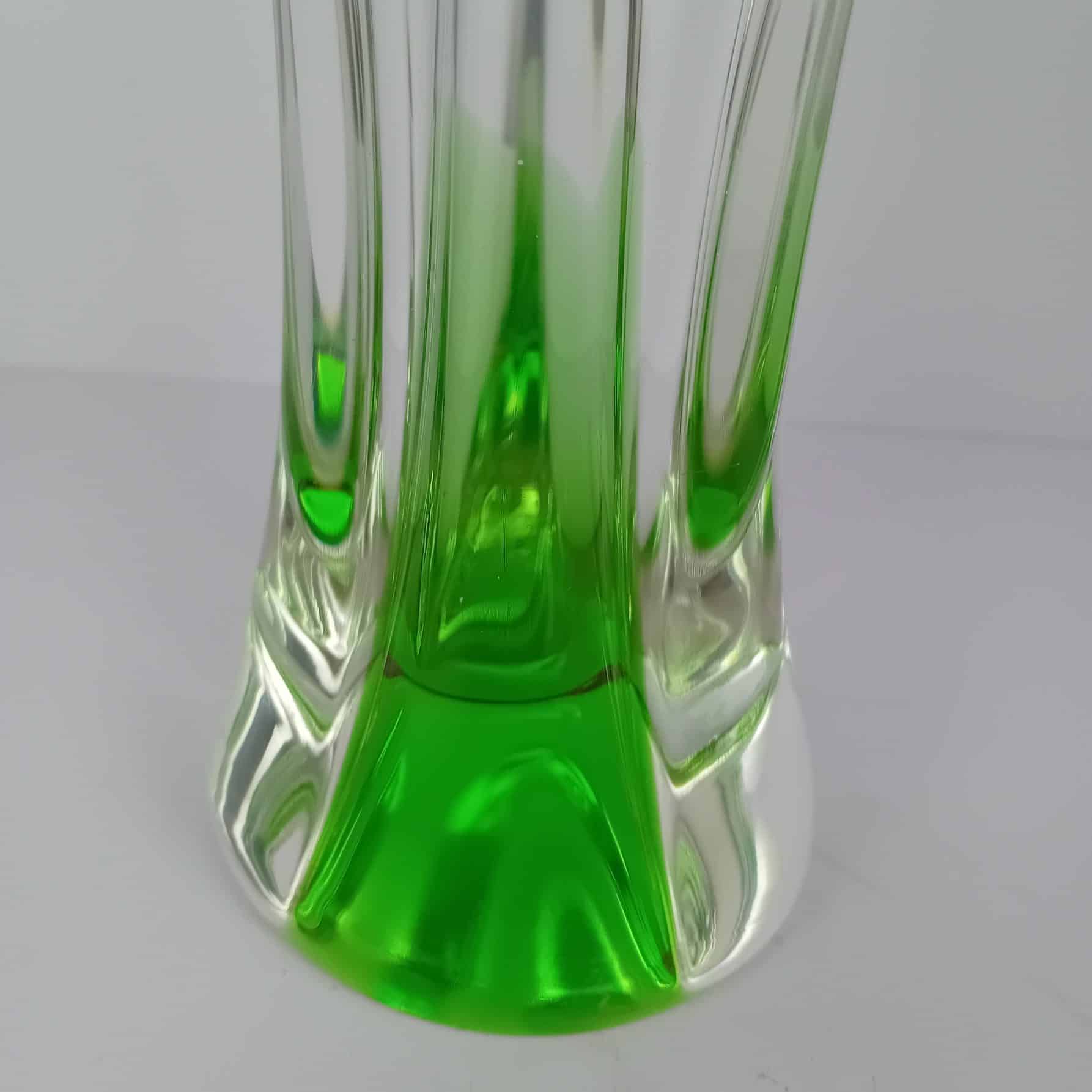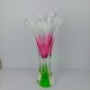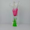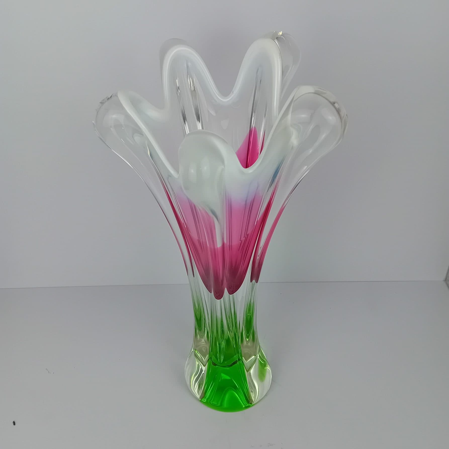 This large and imposing Chribska tri colour vase by Josef Hospodka is a true masterpiece of 1960s/70s Czech glass design. Its striking combination of vibrant pink, green, and white hues against a clear ground creates a mesmerizing effect that instantly draws the eye. Designed by the renowned glass artist Josef Hospodka, this vase perfectly embodies the bold and flowing forms that define mid-century modern art glass.