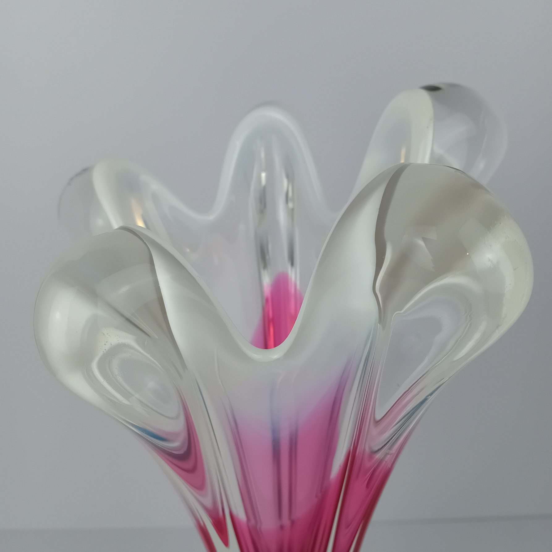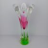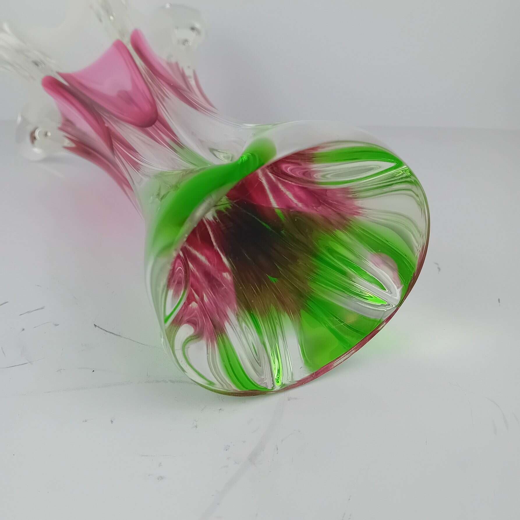 The Chribska Pink White And Green vase was crafted at the legendary Chribska Glassworks, a historic glassmaking center celebrated for its vibrant designs and impeccable craftsmanship. This vintage glass vase stands out not only for its generous size but also for its dynamic shape, which adds a sense of movement and energy to any space.