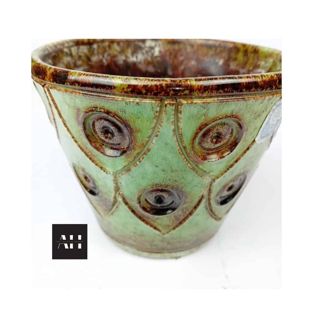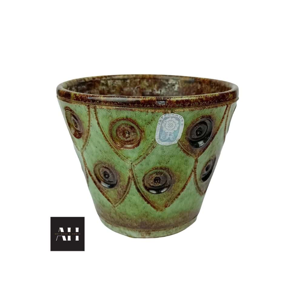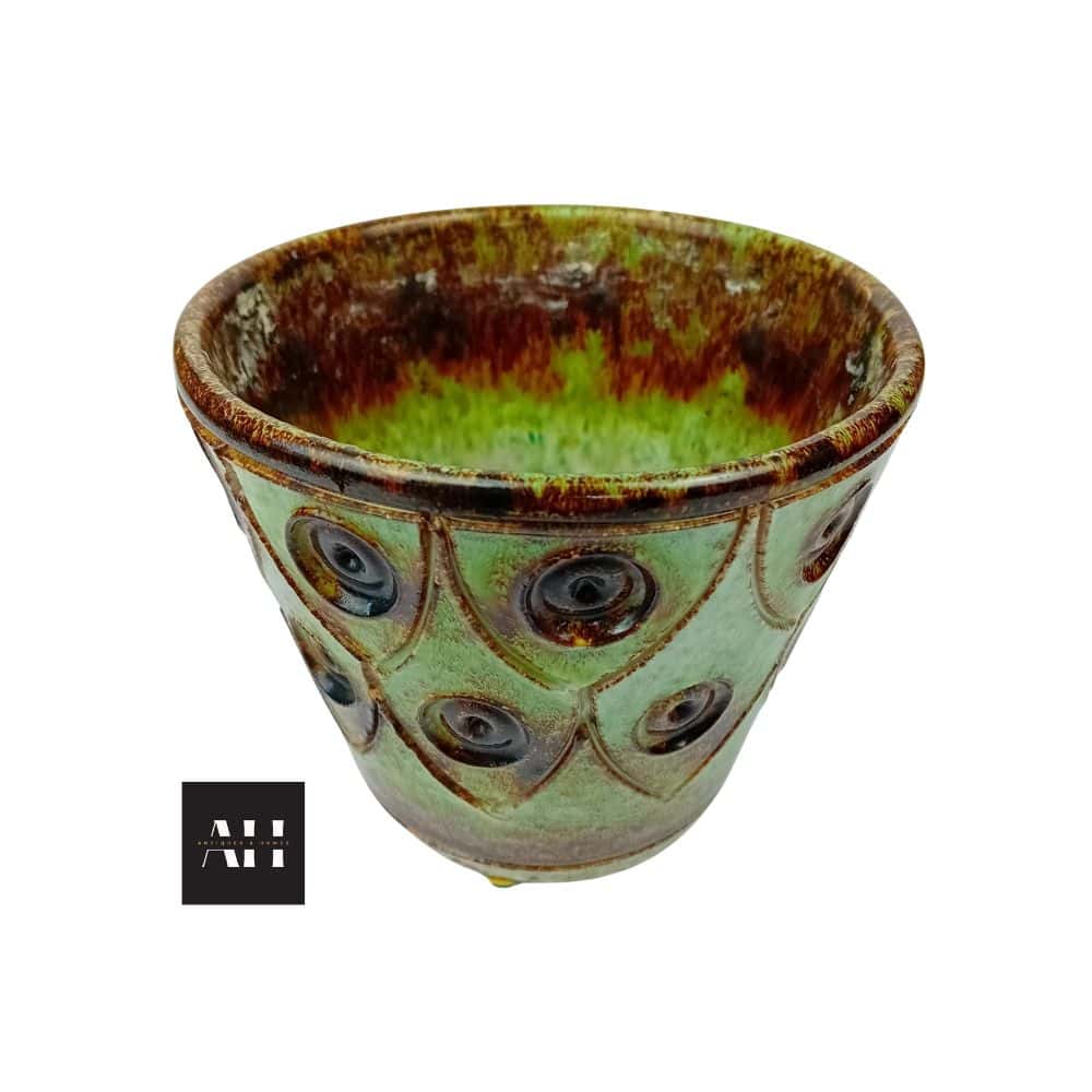 This Vintage Jaffe Rose Plant Pot shows the best of Italian design from the mid-20th century. The pot features earthy brown tones combined with soft green glazes. Raised ring-and-dot patterns add depth, texture, and a strong decorative presence.