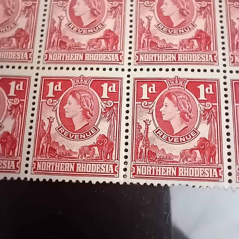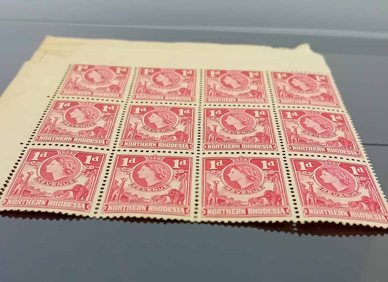Rare Mint Never Hinged Northern Rhodesia 1d Red/Carmine Revenue Stamps (1955) – Block of 12 with Selvage remaining to 2 sides.