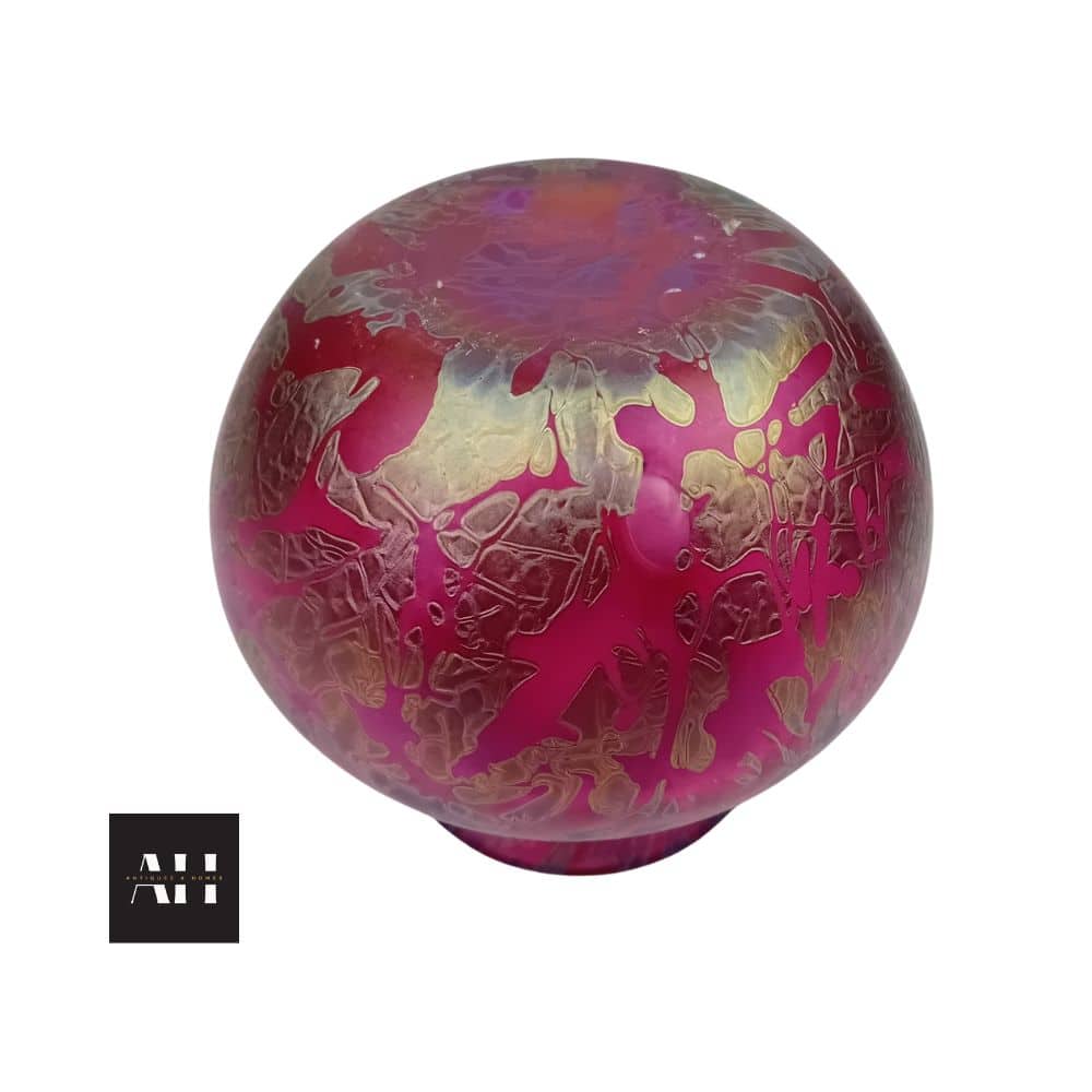 This globe shaped vase displays exquisite craftsmanship, with iridescent tones shifting between red, gold, and subtle violet depending on the light. The flared rim and rounded form enhance its fluid, artistic character.