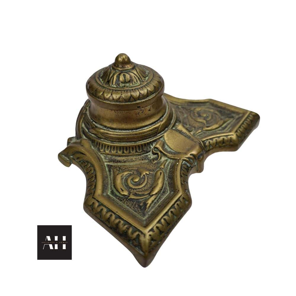 The piece displays well with dip pens, fountain pens, postcards, sealing wax, or other writing accessories. It also works nicely as a standalone decorative accent in a vintage study, library, or office corner. Its sculptural quality makes it equally suitable for collectors of brassware, Art Nouveau décor, and early 20th century design.