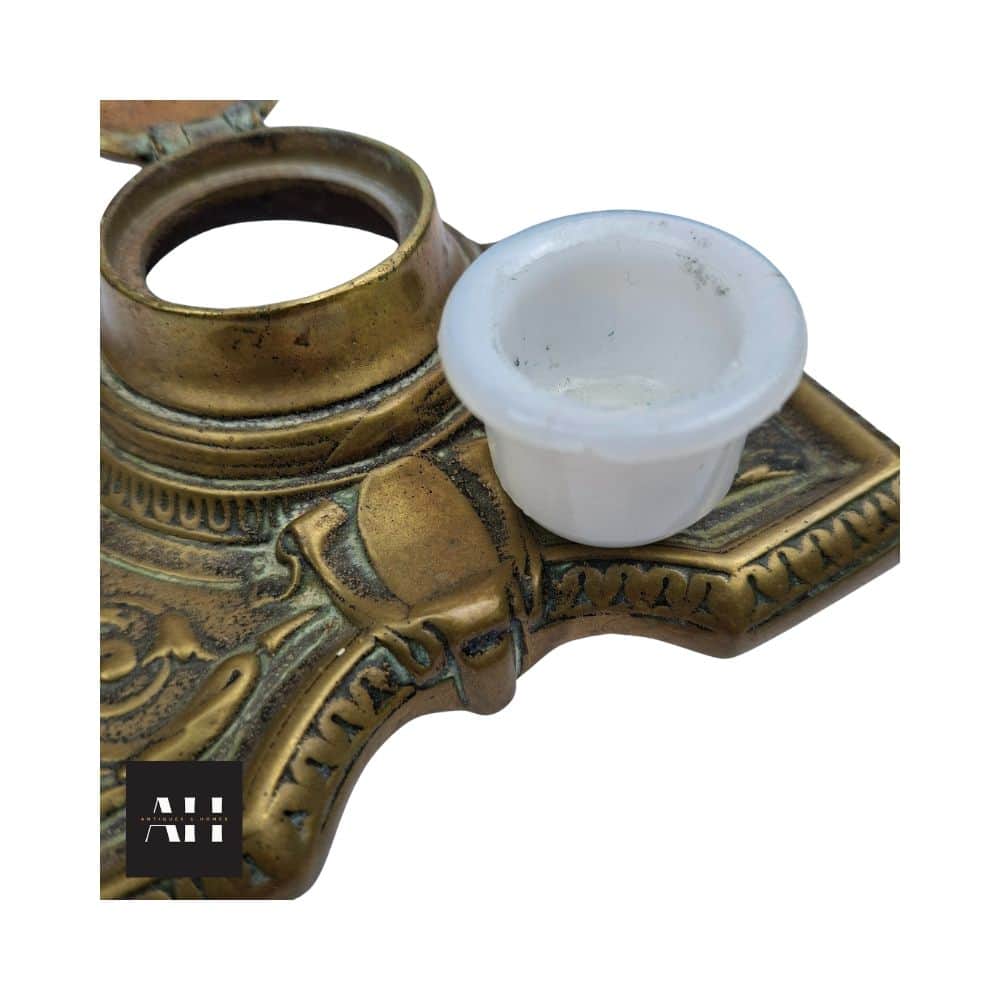 The Single Brass Inkwell sits in very good antique condition, and the brass shows gentle ageing that enhances the Art Nouveau curves. The opaque glass liner remains present and usable, though it has a small rim chip, as shown clearly in the photographs. This does not affect the way it sits inside the holder, and the piece still displays beautifully.