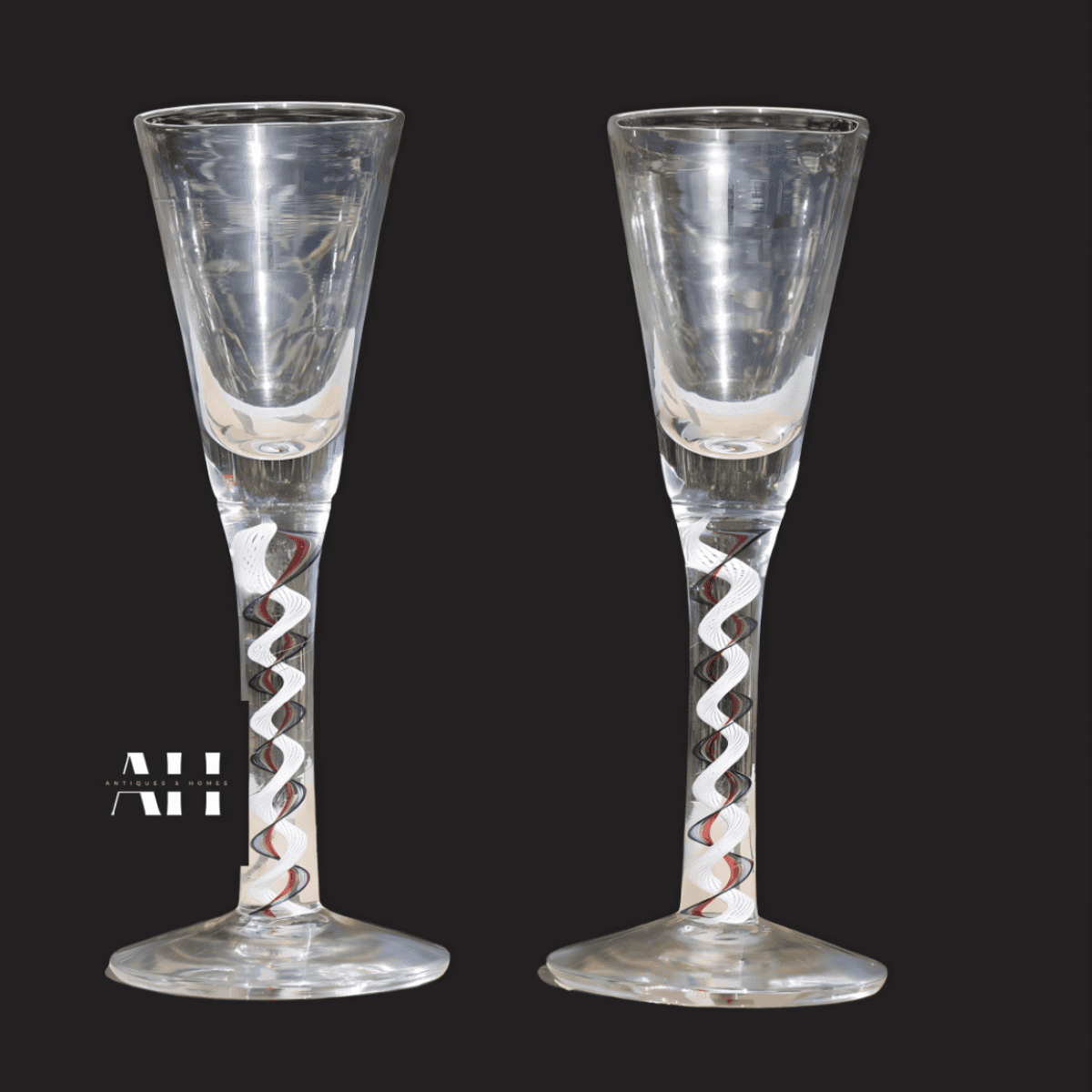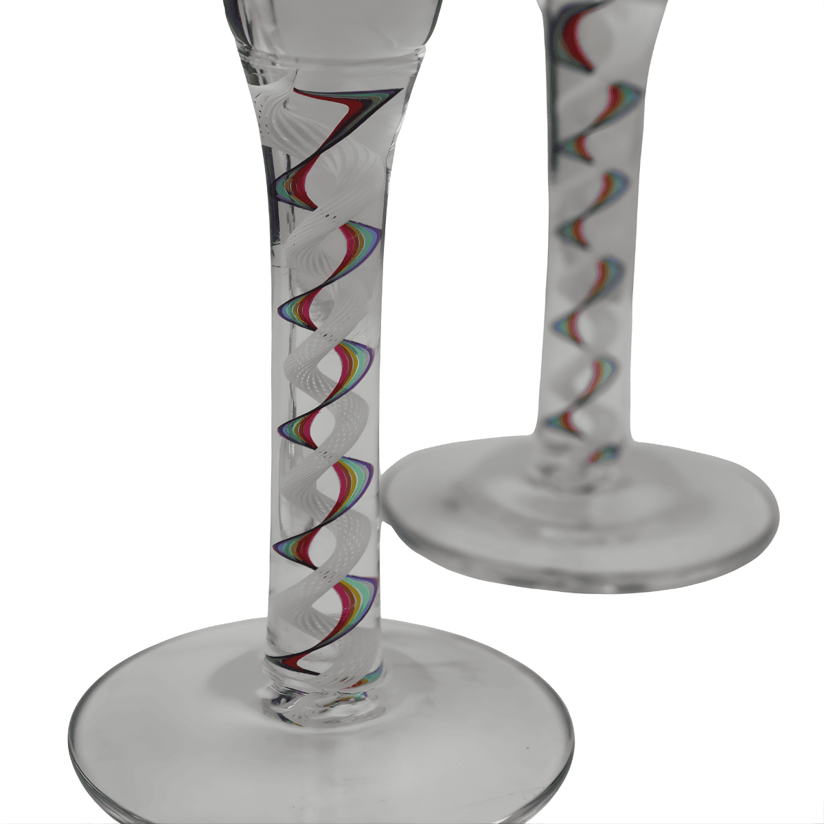 Each glass features a beautifully formed bowl supported by a clear stem containing a coloured Green Red And White spiral air twist. As a result, light catches the internal detailing beautifully, which enhances the clarity and elegance of the form.