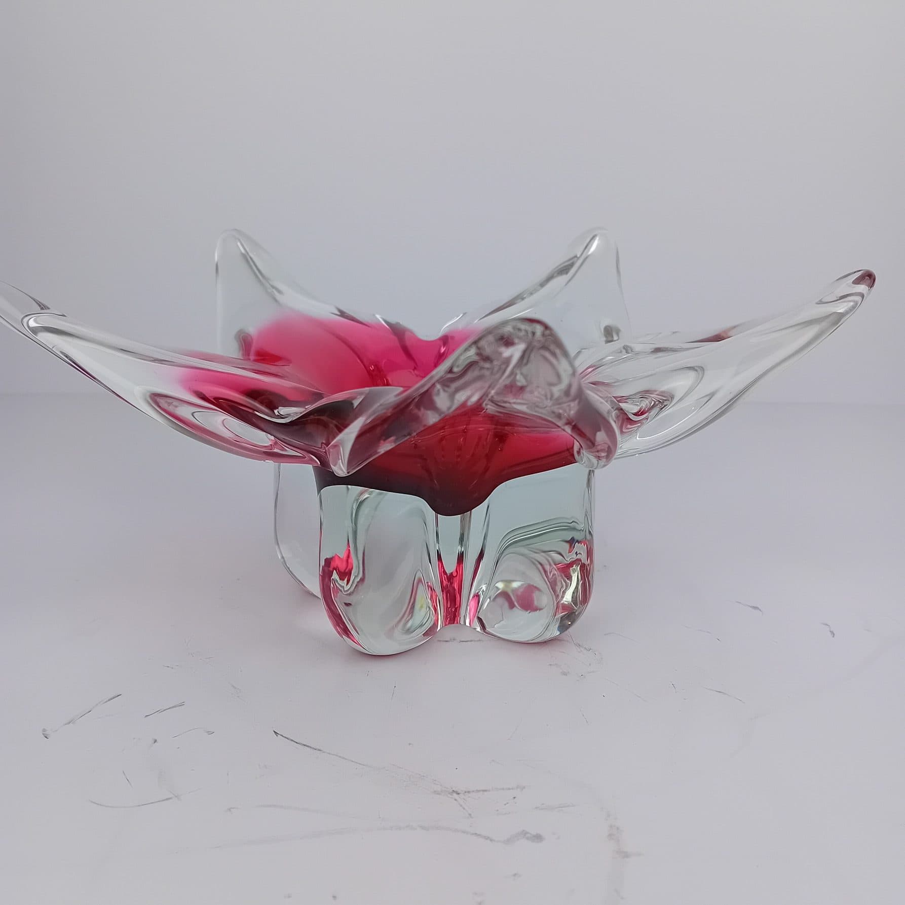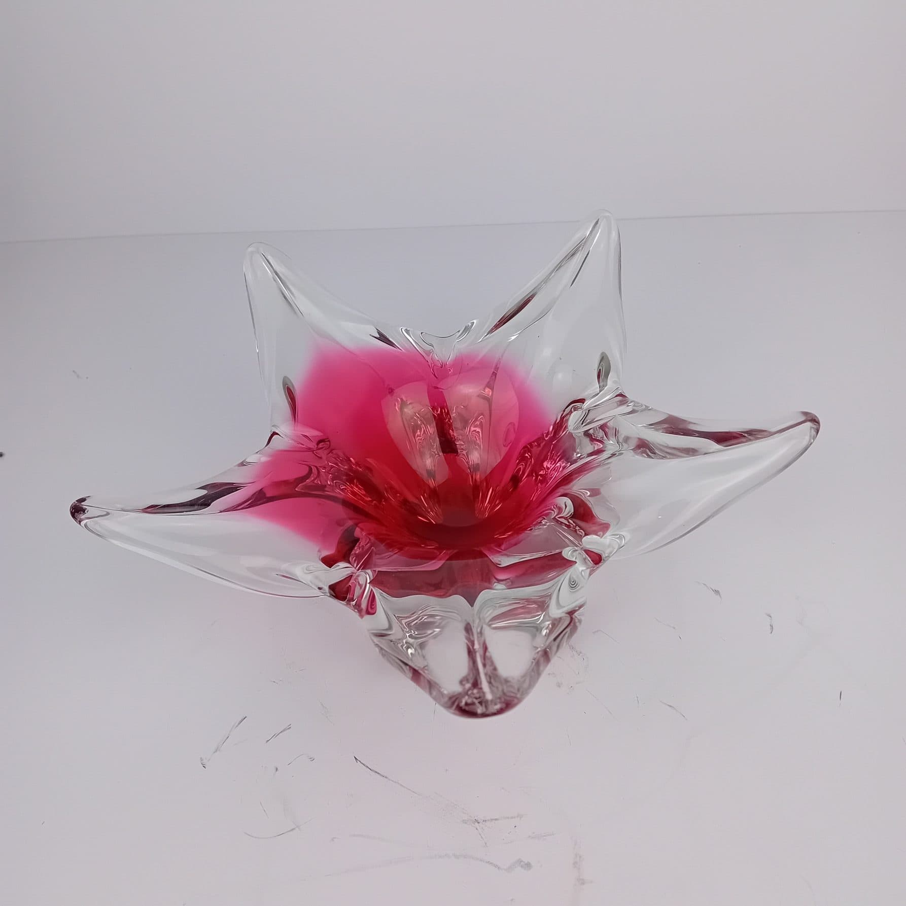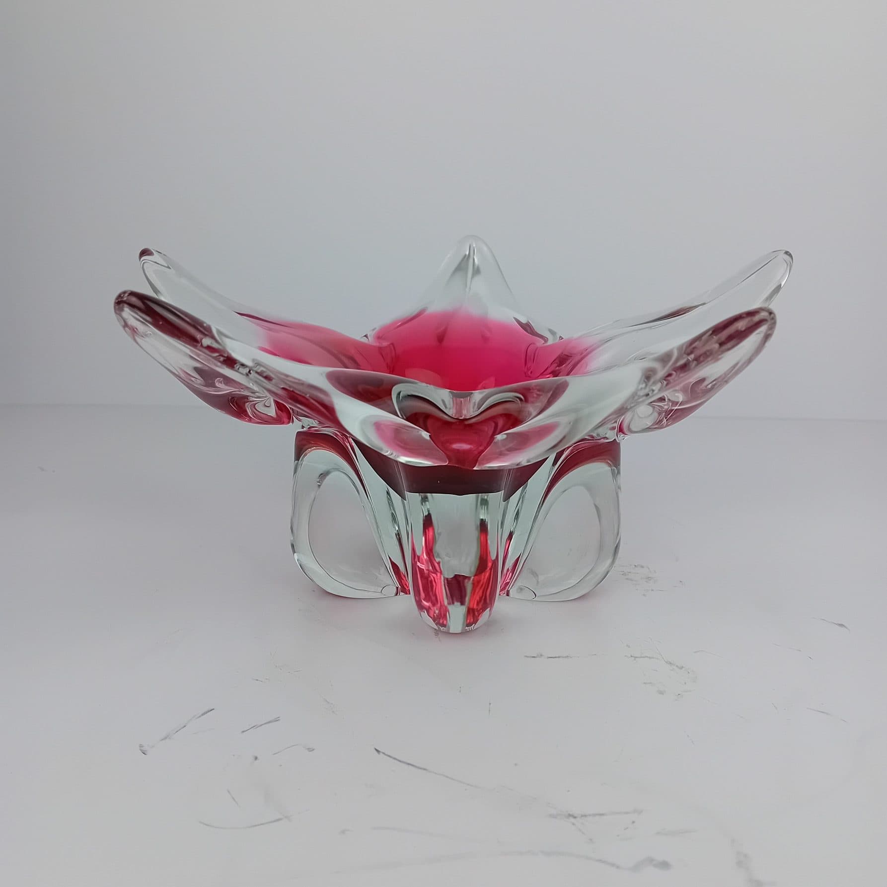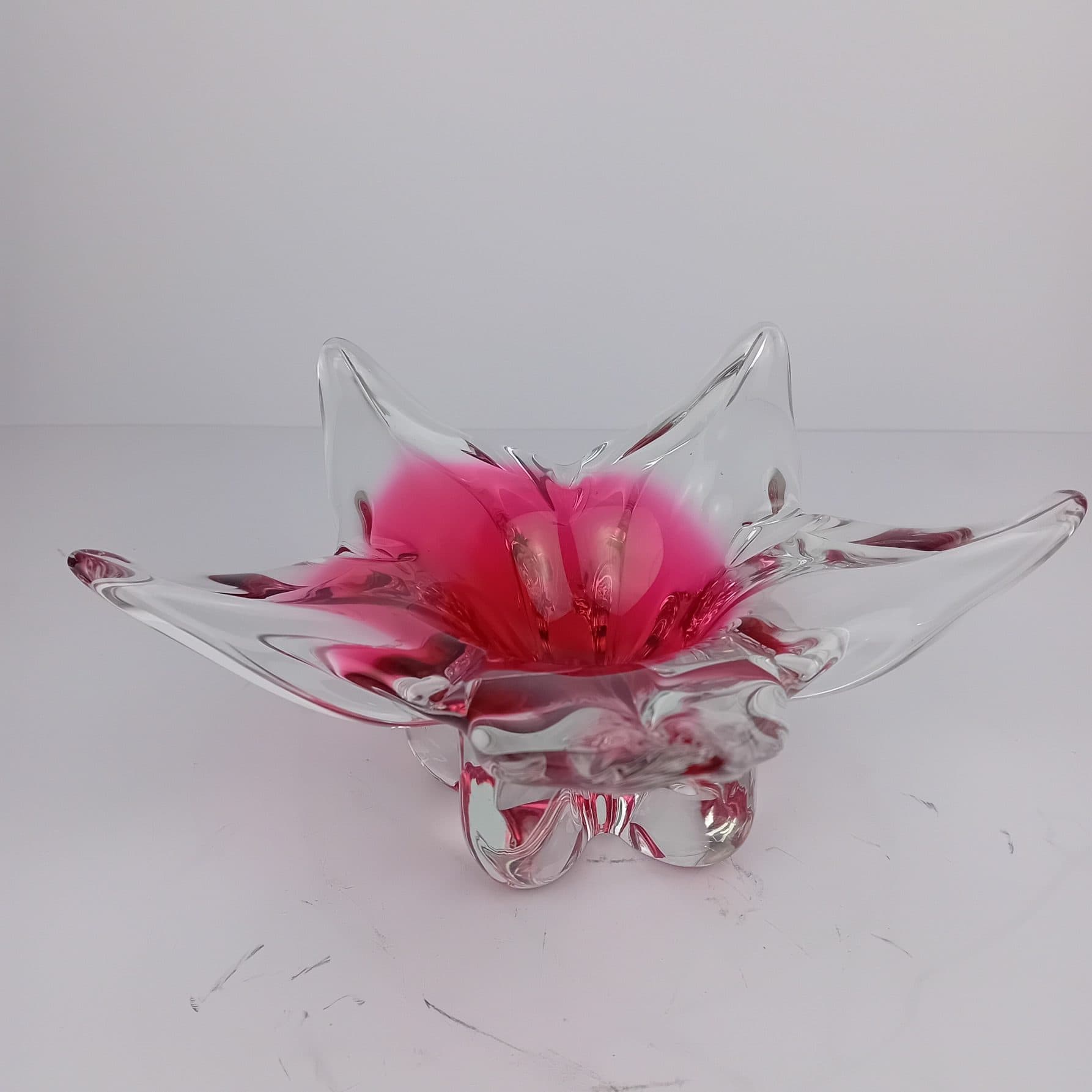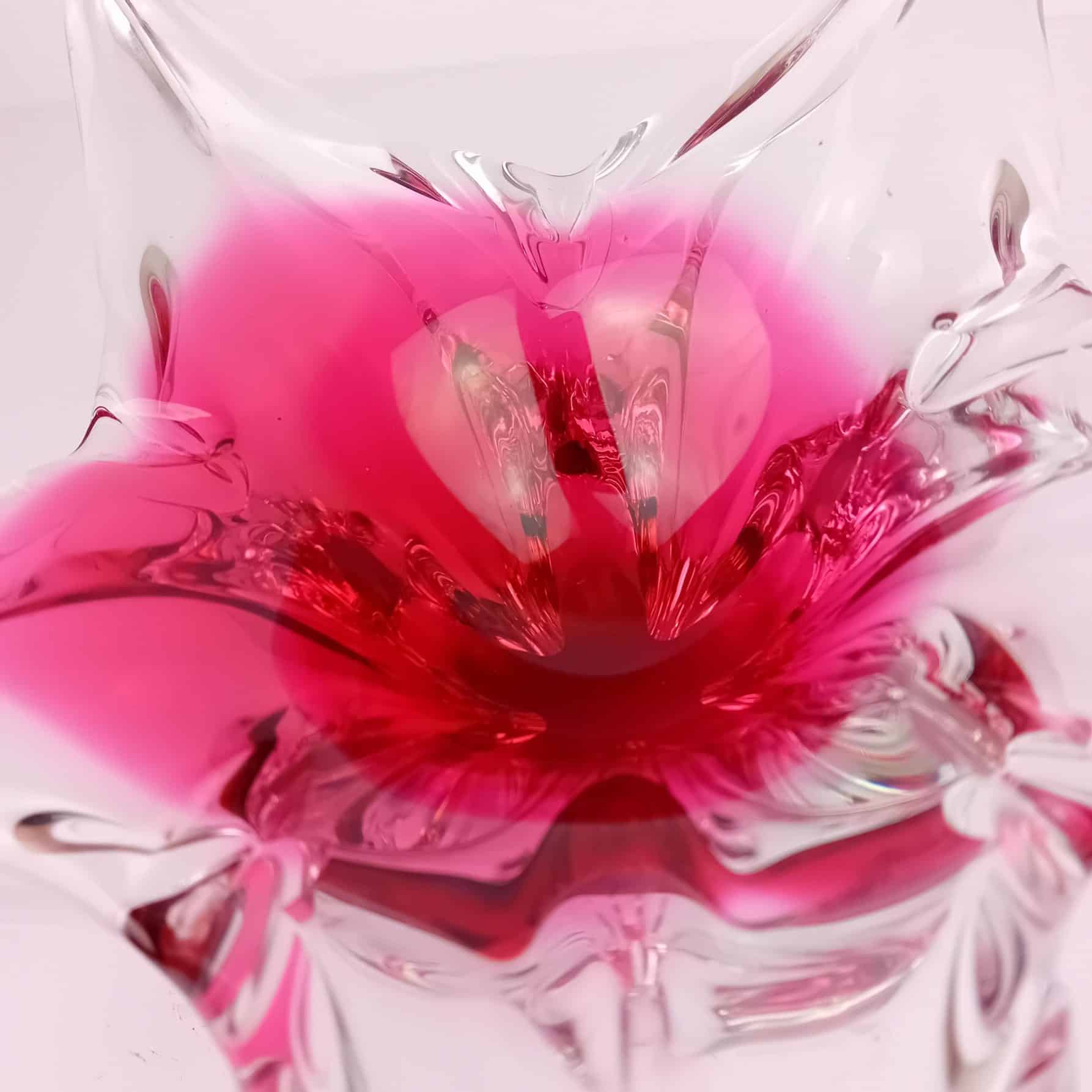 This stunning Czech Art Glass Bowl is attributed to renowned glass artist Josef Hospodka. It is a collectable gem from the 1970s and a hallmark of mid-century modern glass. With its vibrant colours, Pink and Clear glass in fluid form. Showing impeccable craftsmanship, this art glass bowl brings an eye-catching accent to any modern or traditional home.