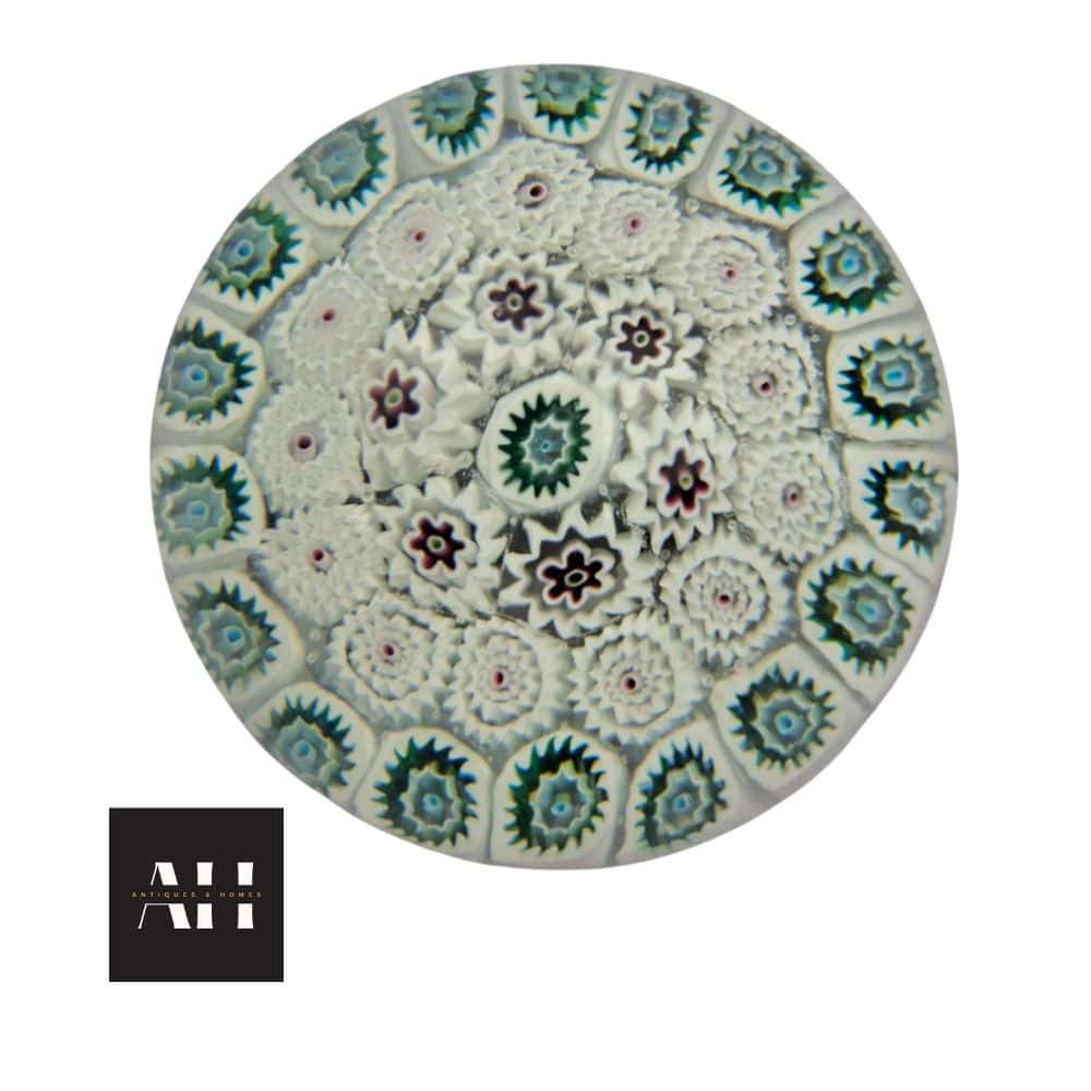 Collectors treasure the White Millefiori Paperweight because it combines centuries of glassmaking tradition with timeless beauty. The word Millefiori means “a thousand flowers” in Italian, and each flower in this design was made by carefully arranging coloured glass canes, cutting them into cross sections, and fusing them within clear glass.
